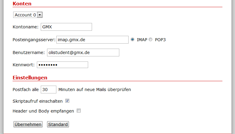 Es können 3 verschiedene Mail-Accounts konfiguriert werden. Einzugeben
