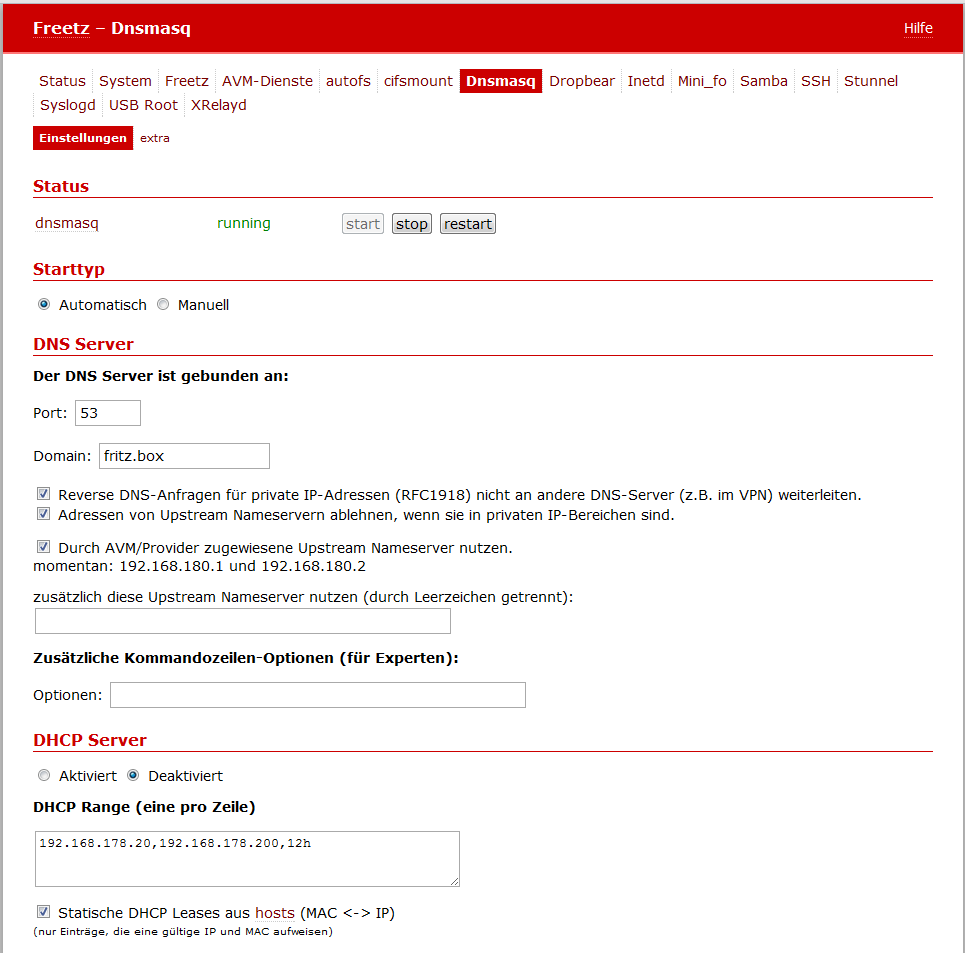 - Pakete / Dnsmasq: Optionen zum Startverhalten, DNS-Server und