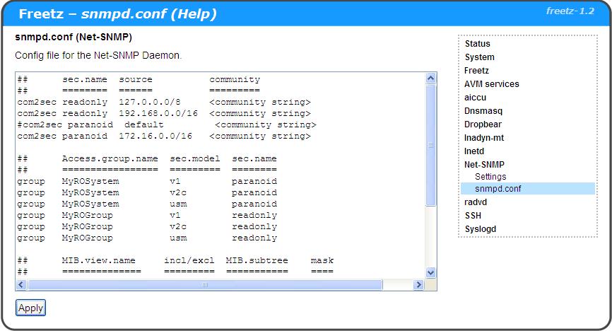 You can edit the snmpd.conf file via the Freetz web-interface via