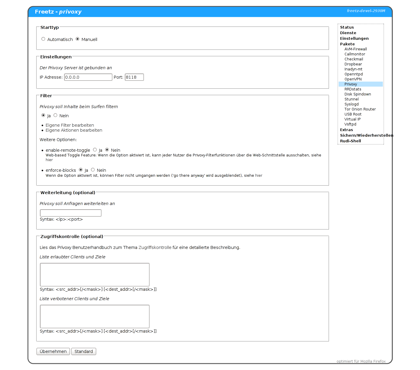 Die Privoxy Zugriffskontrolle ist über das Freetz Webinterface
