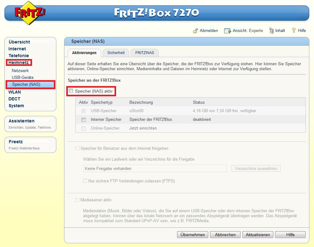 - fritz.box → Einstellungen → Erweiterte Einstellungen → USB-Geräte →
