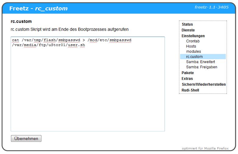 Man kann die Einträge aus 1.) auch direkt in die rc.custom schreiben.
